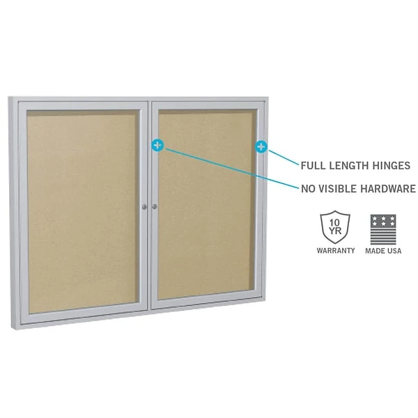 Ghent’s Enclosed Vinyl Bulletin Board is the perfect way to display messages, pictures, and important information securely. The message center is made with a vinyl tack surface that hides pin holes and holds up under repeated tacking, providing years of reliable service. When used outside, our vinyl board will not break down or mold, unlike cork enclosed boards. You do not have to worry about damage from weather or humidity as long as you hang the board under an awning or overhang. Ghent’s 2-door enclosed bulletin boards are protected using shatter-proof acrylic panels, full-length door hinges, and locks that are flush with the frame. You can install the board in high-traffic, public areas without worrying about damage or tampering. Hidden corner brackets allow the message center to sit flush against the wall without any visible hardware which adds protection from vandalism. The colored vinyl surface is paired with a Satin aluminum frame and includes 2 keys. Ships to you in Ghent’s worry-free packaging, designed specifically for shipping enclosed boards. Ghent’s Enclosed Vinyl Bulletin Board carries a 10-year warranty and is made in the USA. Perfect for indoor and outdoor use.