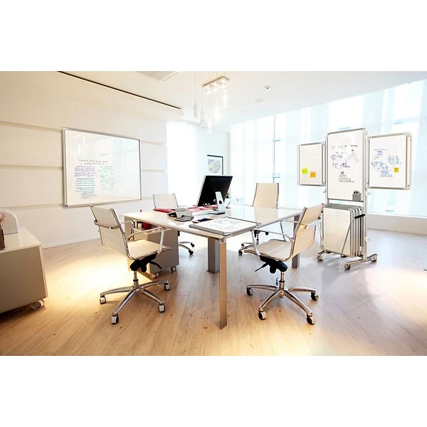 Stylish Nexus design aluminum frame. Mount portrait or landscape with 4 concealed corner brackets for easy and secure hanging. Porcelain-on-steel surface accepts magnets. Durable finish resists scratches and stains. Features magnetic storage bin, 4 markers and 1 eraser. Made in the USA.