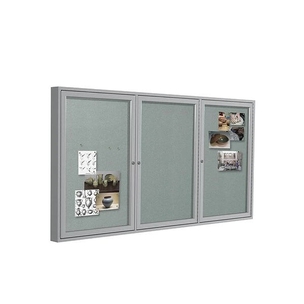 Display announcements, photographs, and promotional materials in a commercial or public space with this three-door enclosed vinyl bulletin board. The self-healing surfaces hold up to repeated tacking, and the shatterproof acrylic panels and satin aluminum frames with two locks ensure safety. This Ghent vinyl bulletin board is durable and weather-resistant, so it’s suitable for indoor or outdoor use.