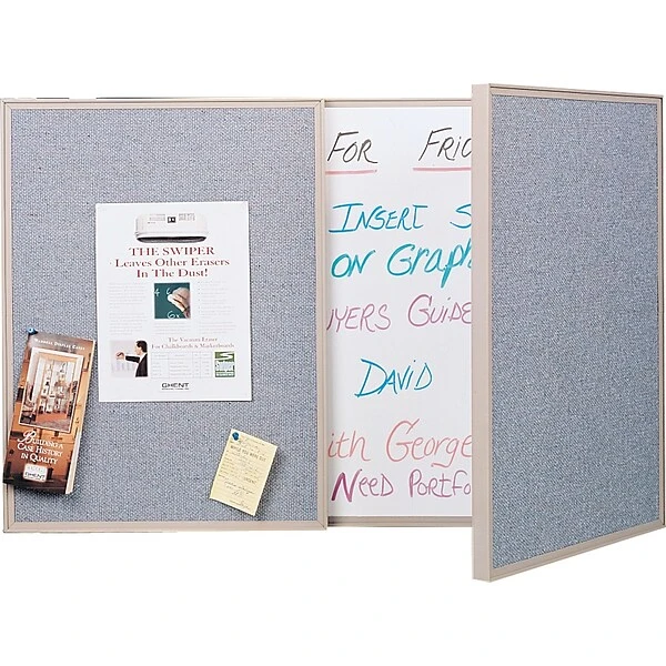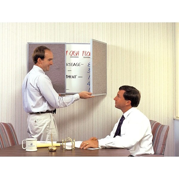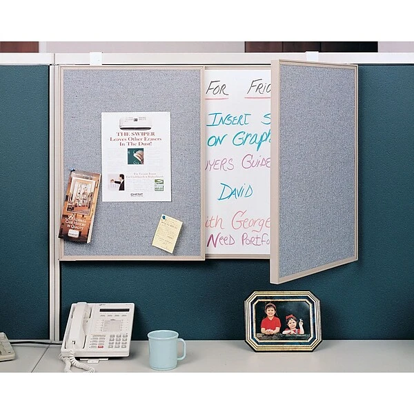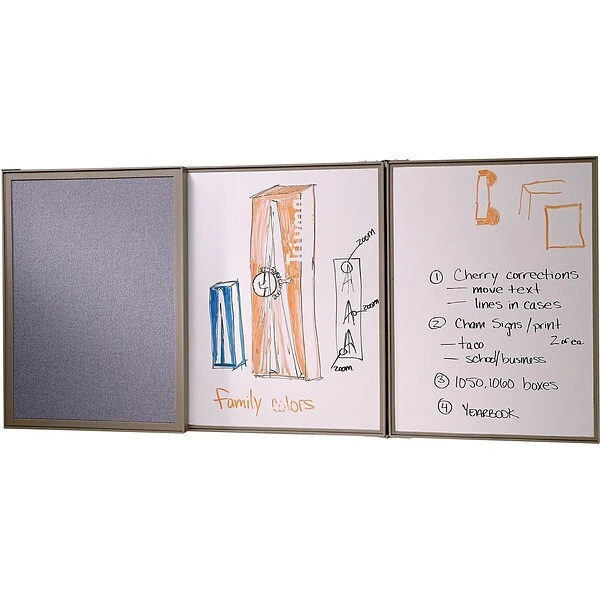 - Opens to a 72″ of dry-erase surface, unit closes to a 36″ fabric bulletin board