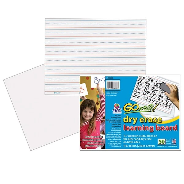 GoWrite learning boards feature a dry-erase surface on both sides of the board. One side is ruled for practicing penmanship or spelling, and the other side is not ruled so it’s perfect for playing classroom games and other classroom activities. Ruled si de includes 3/4″ ruling, a 3/8″ dotted midline, 1/4″ skip space and red baseline. Recyclable board allows students to wipe away their practice and do it again. Boards erase cleanly.