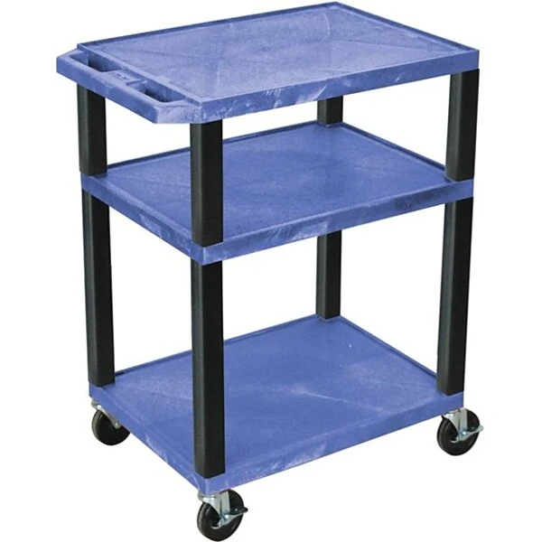 H Wilson® Tuffy AV cart in blue color measures 34″ x 24″ x 18″ and has 3 shelves made of recycled material. Cart with black legs has 1/4″ safety retaining lip to offer minimal sliding.
