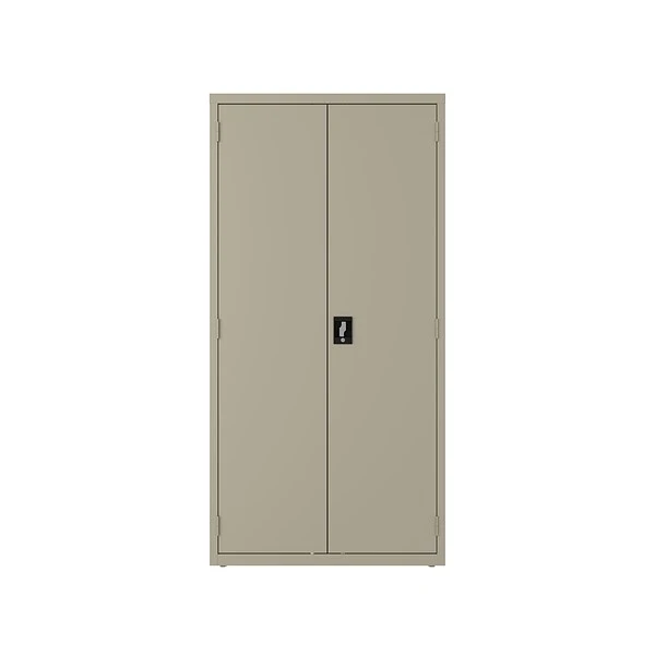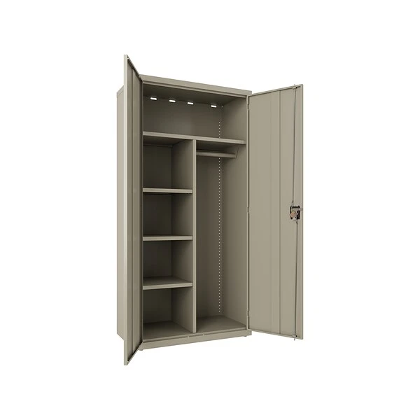The Hirsh steel wardrobe storage cabinet provides a concealed storage solution that is useful in various markets, including business, industrial, education, hospitality, and healthcare. It is a space-efficient, flexible storage solution. This wardrobe has a durable, fully welded steel construction. Painted steel is a nonporous surface that is easy to clean and disinfect. With three half-width adjustable shelves, one full-width fixed shelf, and a hanging rod, this cabinet provides flexible storage that will help keep your essential materials organized. A recessed handle with a core-removable lock provides a three-point locking system that locks the top, bottom, and doors to keep your items secure. Shelves are adjustable in 1″ increments with 180 lbs. shelf capacity on the full-width shelf and 90 lbs. capacity on half-width shelves.