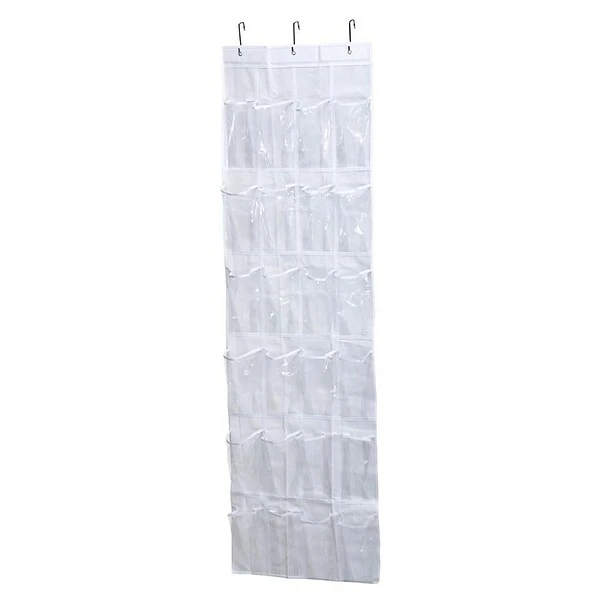 Honey Can Do Over the door closet organizer measures 64″ x 2.5″ x 18.5″ and has protective PEVA that prevents moth and musty odors. Organizer has 24 pockets and can hold up to 12 pair of shoes.