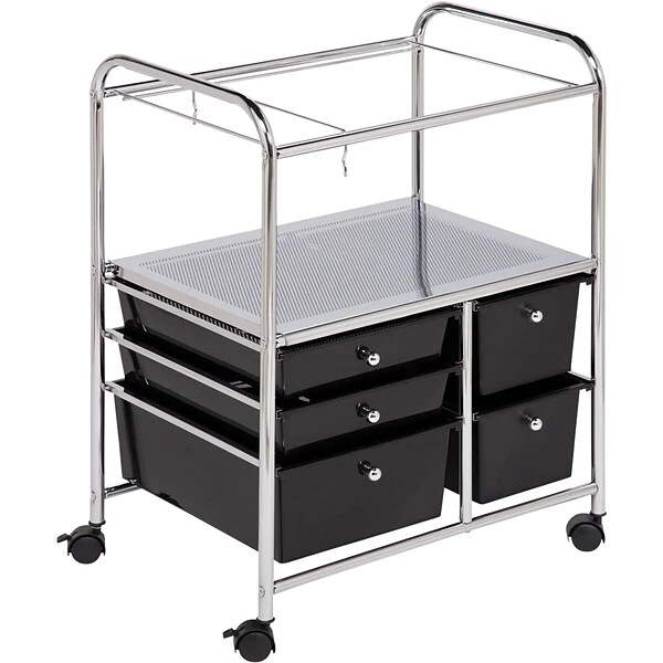 The drawer has top filing space that holds legal or letter hanging files to organize any size documents and the perforated metal base supports heavy files. It comes with chrome pull knobs that slide open to store paper and supplies. The cart moves easily on four smooth rolling casters then locks in place.