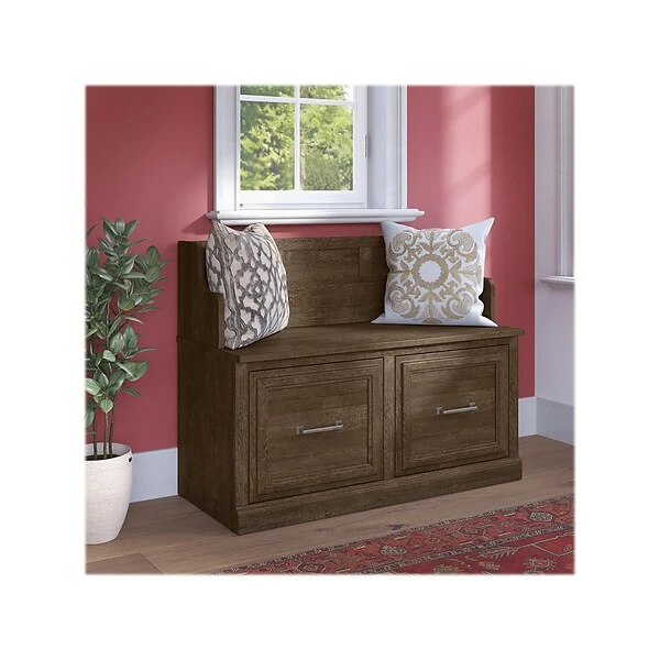 The kathy ireland Home by Bush Furniture Woodland entryway bench with doors combines transitional styling and a practical design to offer a perfect shoe storage solution. Have a seat on the shoe bench surface, and take a moment to relax as you get ready to head out the door or come home after a long day. The top of the mudroom bench supports up to 250 lbs., so you can sit down to put on and take off your shoes or set shopping bags down after a trip to the store with confidence. The cabinet doors conceal two internal compartments that keep footwear in order and out of sight. The entryway organizer’s transitional design blends elements of contemporary and traditional styling to complement a wide range of home furnishings. This storage bench with a back has been tested to meet Bush Furniture’s standards for safety, performance, and durability, and is backed by a 3-year warranty.