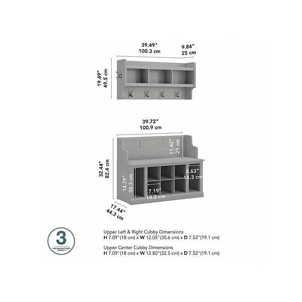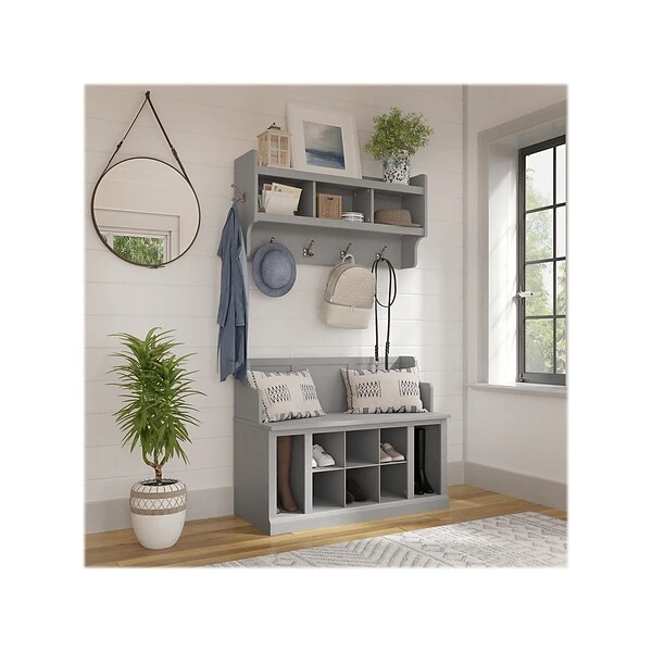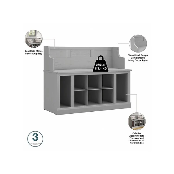 The kathy ireland Home by Bush Furniture Woodland entryway bench with shelves and wall-mounted coat rack combine transitional styling and a practical design for an excellent storage solution. Have a seat on the shoe bench and take a moment to relax as you get ready to head out the door or come home after a long day. The mudroom bench supports 250 lbs., so you can sit down to put on your shoes or set shopping bags down after a trip to the store with confidence. Open storage that includes six cubby spaces and vertical shelves on either side keeps footwear in order. The wall rack features six coat hooks for hanging jackets, hats, and scarves. Smaller items such as gloves and keys can be stashed neatly inside three open compartments. The entryway bench and coat rack have been tested to meet Bush Furniture’s standards for safety, performance, and durability and are backed by a 3-year manufacturer limited warranty.