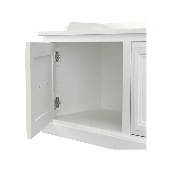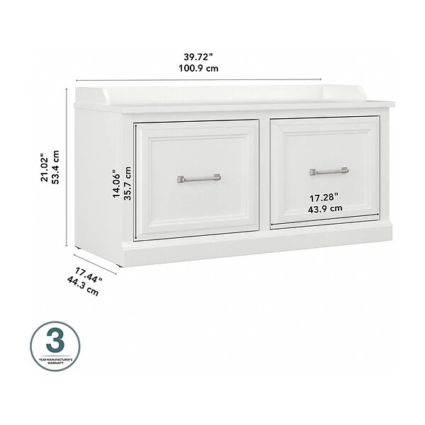 The kathy ireland Home by Bush Furniture Woodland 40″W shoe storage bench with doors combines transitional styling and a practical design to offer a perfect entryway organizer. Have a seat on the durable bench surface, and take a moment to relax as you get ready to head out the door or come home after a long day. The top of the mudroom bench supports up to 250 lbs., so you can sit down to put on and take off your shoes or set shopping bags down after a trip to the store with confidence. Cabinet doors conceal two compartments that keep footwear in order and out of sight. The shoe bench’s transitional design blends elements of contemporary and traditional styling to complement an array of home furnishings. This entryway bench with storage has been rigorously tested to meet Bush Furniture’s standards for safety, performance, and durability and is backed by a 3-year manufacturer’s warranty.
