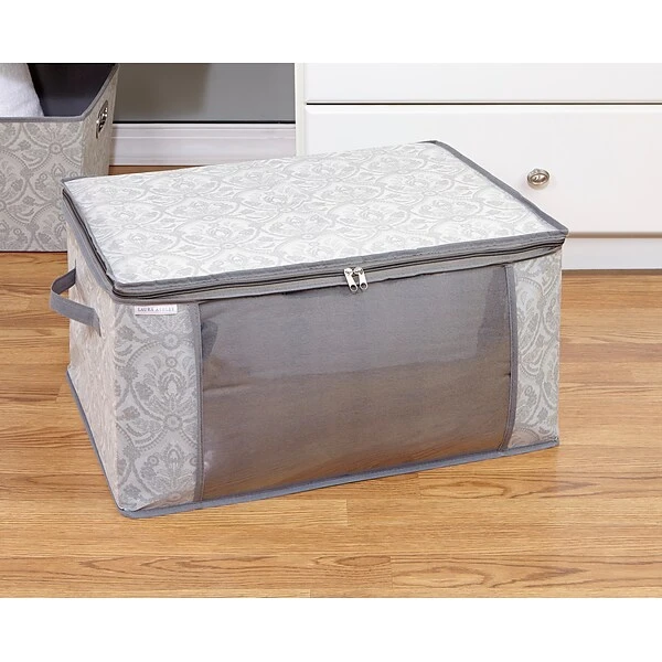 Laura Ashley’s Non-woven Blanket Bag is made of 100% PP Nonwoven breathable Material that keeps your blankets and other belongings safe. Perfect storage solution for off-season items such as blankets, garments and more while also protecting them against dust and damage thanks to it’s full zippered top. Durable handles allows for easy carrying and see through window on front allows you to look inside of the bag. Bag helps eliminate odors to help linens stay fresh and clean. Flexible and adjustable designs makes it easy to fit in tight spaces to store.