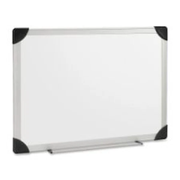 - Dry-erase board features a laminated styrene surface and sturdy aluminum frame