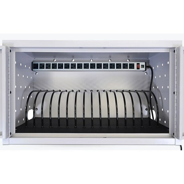 Do away with cord clutter while safely ensuring devices are always charged and ready for use. A steel shell with lockable door coupled with a padded interior and rubber-coated dividers protect your devices, and the compact size makes Luxor Tablet Charging Cabinets great for wall mount or desktop use