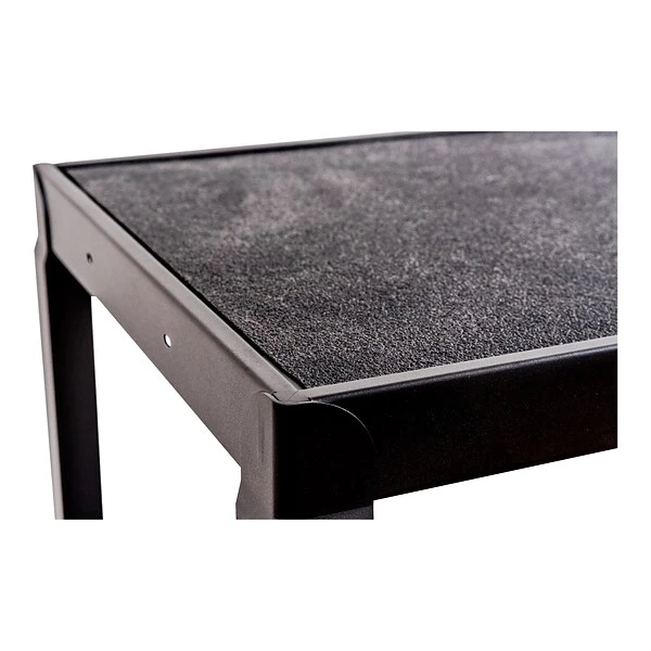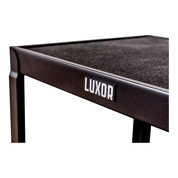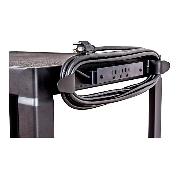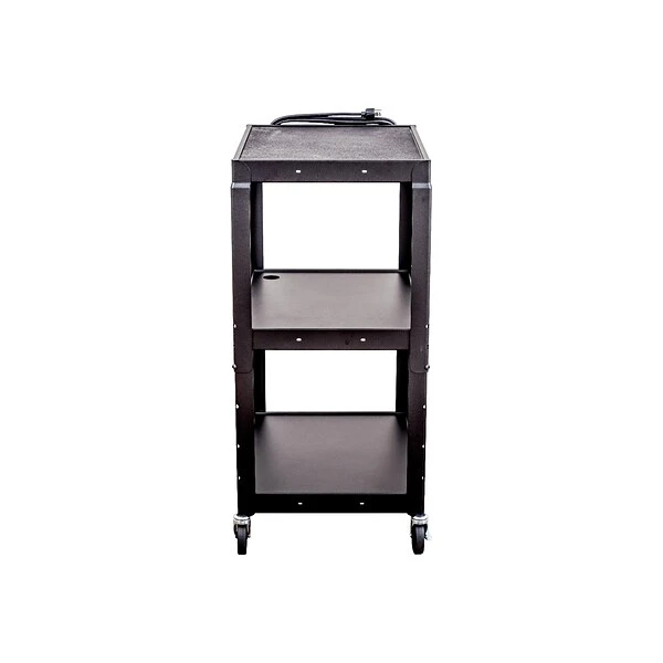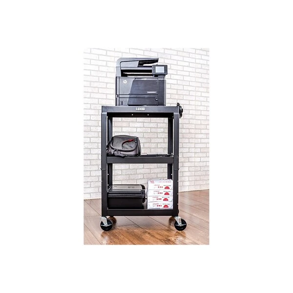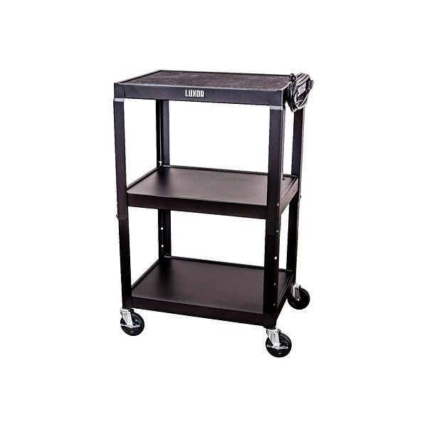 Prepare for classroom lectures or business meetings with this Luxor adjustable height multimedia cart. Robotically welded steel construction delivers strength and stability, while the full-swivel ball-bearing casters offer smooth, effortless movement. Two casters lock in place to keep electronic equipment securely in place during presentations. Each of the three shelves comes with a textured mat to prevent items from slipping. This Luxor adjustable height multimedia cart features a cable management system to keep wires and cords organized.