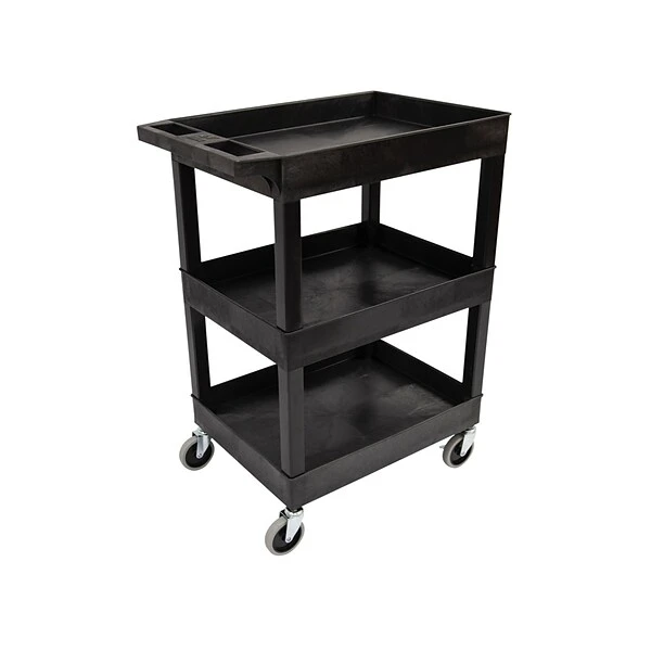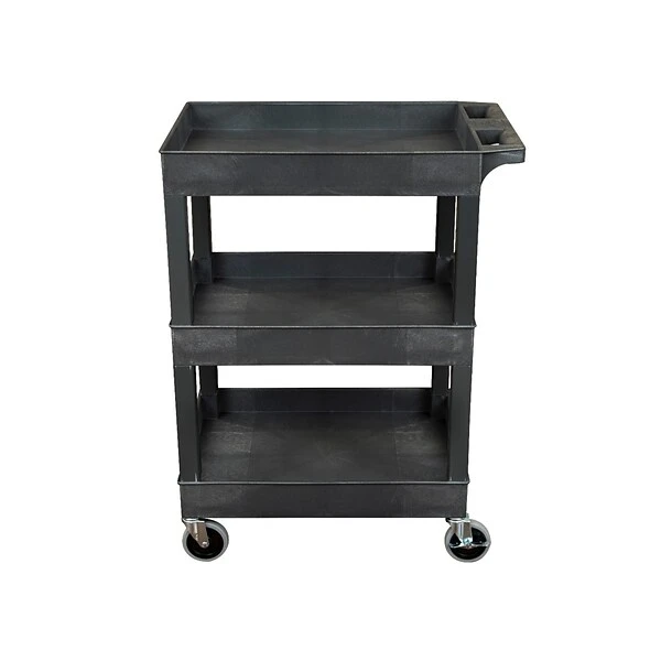 - Three shelves safely transport goods in 2.5″ deep tub area