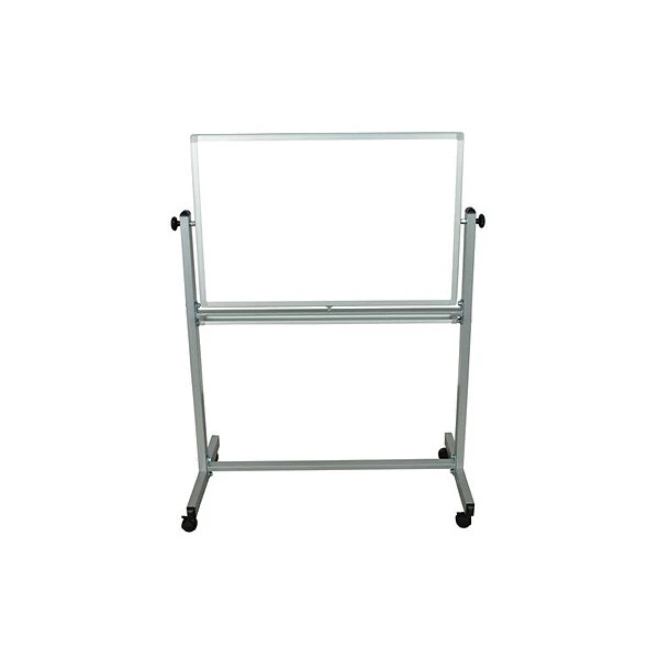 Turn any gathering spot in the office into a spontaneous meeting room with this mobile Luxor whiteboard. This whiteboard features two note-taking surfaces on a reversible board, giving you plenty of room for brainstorming, diagramming flowcharts and taking notes. Both sides are magnetic, making it easy to attach papers and printed material for convenient reference. Four casters and a strong but lightweight aluminum frame offer convenient mobility for easily moving the board anywhere you need it. This double-sided whiteboard gives you twice the note-taking area without an increase in size. When one side fills up, simply flip the board over, and continue on the other side. Once in position, the board locks in place for a sturdy surface on which to write. Both sides of this magnetic whiteboard let you use magnets to attach papers, notes, brochures and other printed material, making it easy to share and reference the information without having to copy it out by hand. When not in use for taking notes during meetings, the board can double as a magnetic bulletin board for posting notices and important communications. Wheel this whiteboard anywhere you need it on four casters offering easy mobility. The durable, chrome-finished aluminum frame is strong but lightweight, allowing you to move the board from room to room easily.