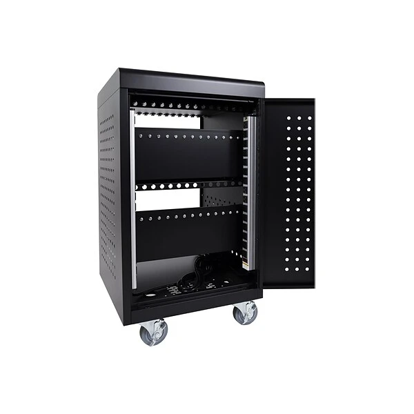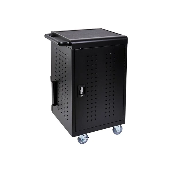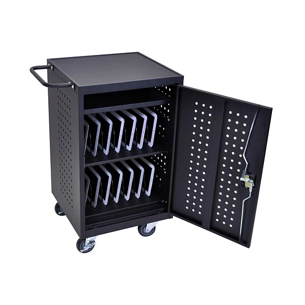 Keep tablets securely stored away with this Luxor 30-outlet tablet charging cart. Rubber-coated dividers prevent tablets from damage, and ventilation ports keep air circulating freely throughout the interior compartment. Two power strips with 15 outlets each provide a power source to charge each tablet stored in this cart. Featuring locking front and rear access doors with two separate keys, this Luxor 30-outlet tablet charging cart prevents unauthorized access to tablets and Chromebooks after hours.
