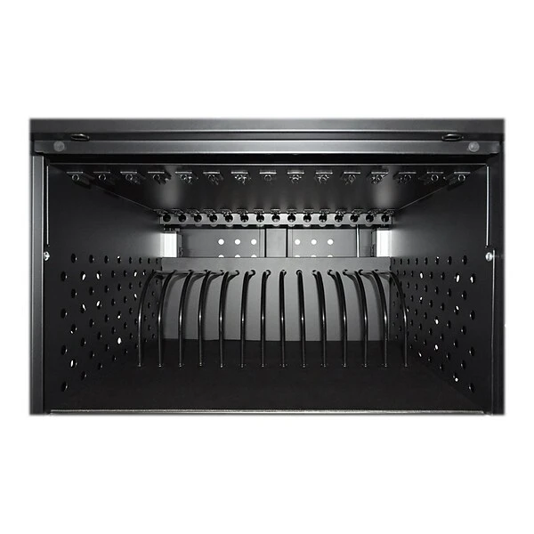 - Charges up to 30 tablets or Chromebooks (15 per shelf)