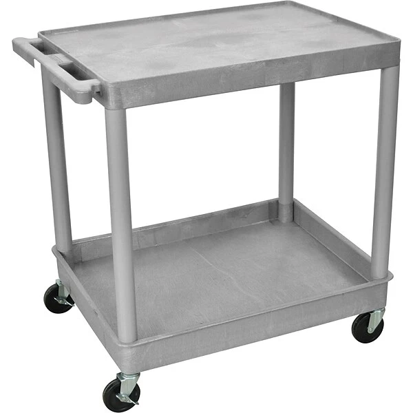 Luxor TC Series Large flat tub & top bottom shelf cart in gray color measuring 35 3/4″ x 32″ x 24″ has polyethylene structural foam injection molded plastic shelf and leg. Cart consists of 2 shelves with 25″ clearance.