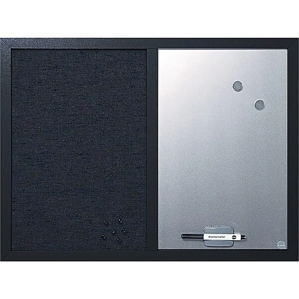 Brainstorm with colleagues and express creativity with this combo bulletin and dry-erase board. A durable fabric surface lets you pin up notes and reminders without showing pin holes. The magnetic silver-colored dry-erase surface is easy to clean and offers lasting durability, suitable for writing, drawing, and using magnets to hang notes. This MasterVision combo board has a sturdy frame and includes hanging hardware for installation on cubicle walls and other surfaces in either a vertical or horizontal position.