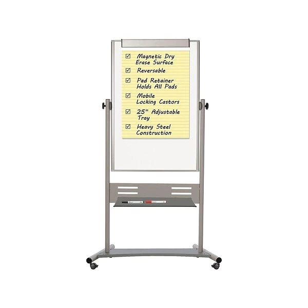 Create detailed plans on the MasterVision Evolution double-sided Dry-Erase presentation easel for clear communication with your staff members or students. Its lacquered steel surface is easy to wipe clean and is resistant to staining and ghosting. Its large accessory tray keeps markers readily available. The magnetic surface of this MasterVision Evolution easel lets you easily post papers.