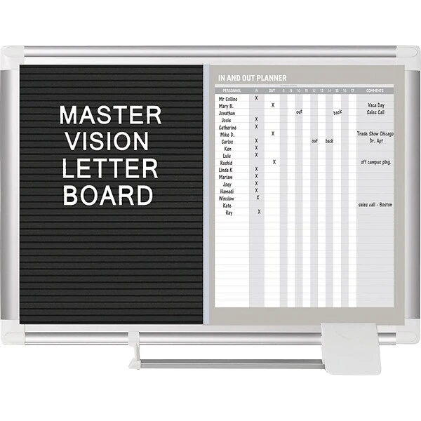 Keep track of everyone coming and going with this magnetic Gold Ultra dry-erase board and letter board combo