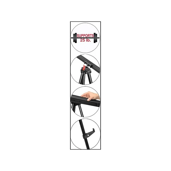 Support up to 25 pounds of display materials with this tripod stand, which features a fully adjustable easel pad holder that can be set up one-handed. This easel is made with telescoping aluminum legs that can hold displays from 34 to 63 inches high and lock into place with a center brace. This MasterVision telescoping easel also features non-skid feet for sturdy arrangement on any floor or table.
