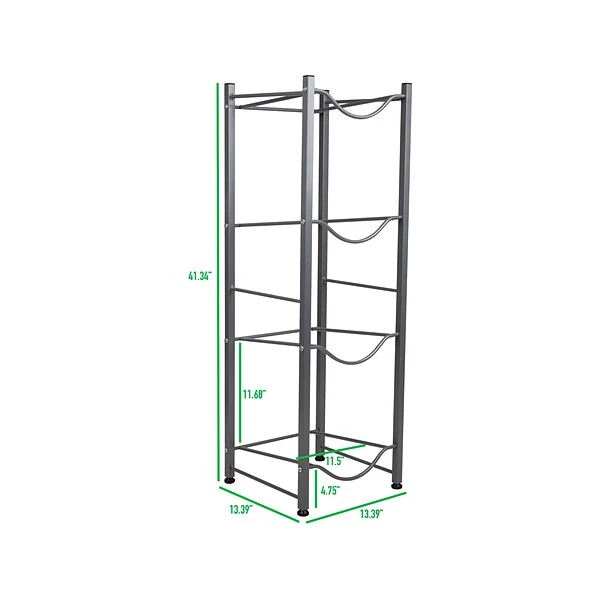 Enjoy a stylish way to stack your water jugs with this tiered storage shelf from Mind Reader. Water cooler jugs can be unwieldy and occupy tons of space in storage closets, office break rooms, and other similar locations. The large jugs that fasten atop your office water cooler don’t naturally stack well, and while having multiple bottles on hand makes it easy to refill, these oversize containers can take over a whole closet quickly. Storing them this way not only requires too much space, but also puts too much strain on the backs of people who need to bend over and try to hoist these heavy nuisances off the ground. The Mind Reader Alloy Collection sturdy tiered shelf designed with these specific water cooler bottles in mind makes a perfect solution for your storage closet. The stainless steel bars are molded to conform to 5 gal. water jugs, so you can easily stack them facing forward or backward. The unit holds up to four bottles at a time and includes adjustable feet fitted with rubberized grips to protect your floor and keep bottles stable.