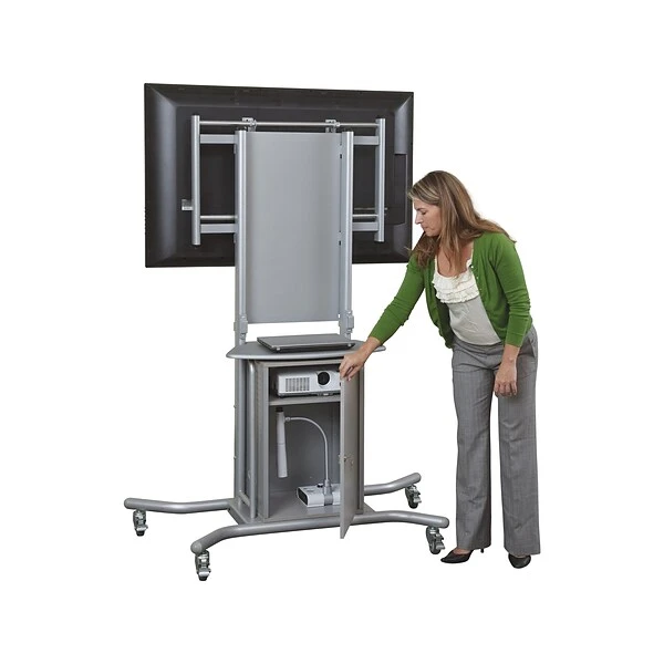Mount a flat panel TV or monitor to this MooreCo Elevation flat panel cart to share visual aids with your next presentation. The brushed silver frame offers an executive look, while the bracket is adjustable at 43 and 59 inches for comfortable viewing throughout the room. This MooreCo Elevation flat panel cart is compatible with optional storage cabinets and laptop shelving to increase its functionality, while locking caster wheels deliver safe mobility from room to room.