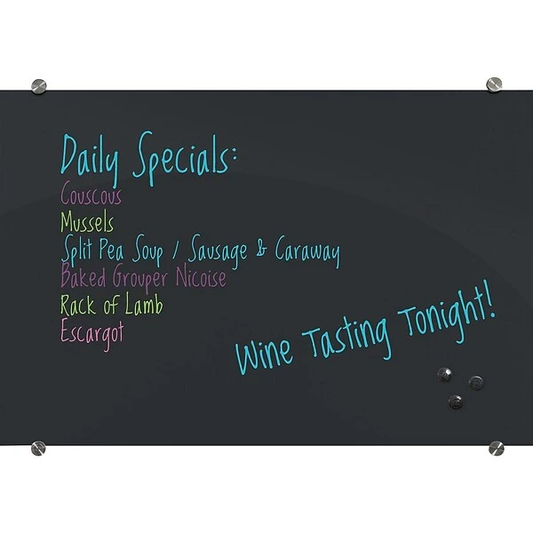 - Tempered safety glass with a smooth finish accepts dry erase, wet erase, chalk markers, and more