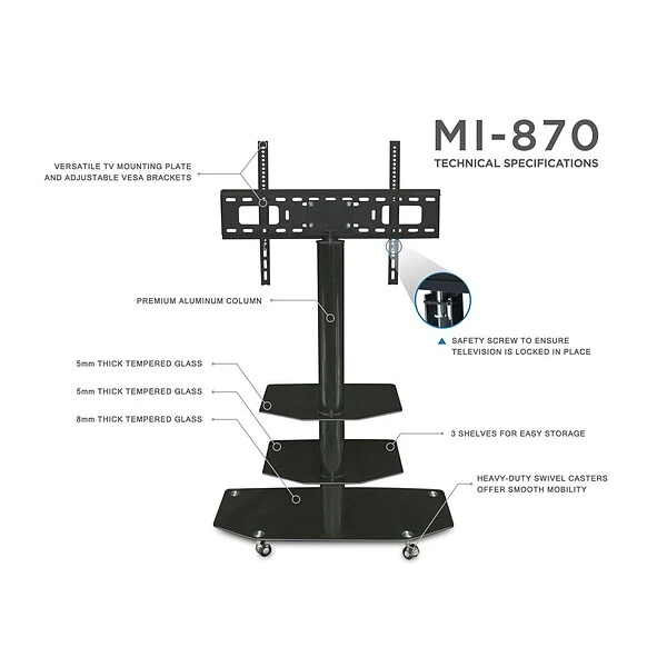 MI-870 two-in-one stand is a wheeled cart and TV mount in one. It fits small to large flat TV panels while also serving as storage for your other entertainment appliances. Move your entertainment set in a fast and convenient way using this stand’s heavy-duty caster wheels that offer smooth mobility. With this stand, you can effortlessly transport your display screen or television set around the home, the office, or anywhere else you want it to be. The three glass shelves, on the other hand, provide ample space for DVD and Blu-Ray players, cable TV boxes, AV components, gaming systems, home theater systems, vinyl turntables, and much more. This also makes cables much easier to manage.