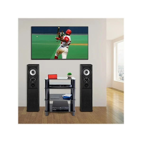 The Mount-It! entertainment media stand brings convenience, style, and function back into the contemporary home. Tempered glass shelves and black stainless steel supports provide a stable organizer for your cable box, DVD player, audio equipment, gaming console, and more. Spacing between the shelves allows for easy access to cables and encourages healthy airflow around your equipment, ensuring your devices don’t overheat. All necessary hardware is included.
