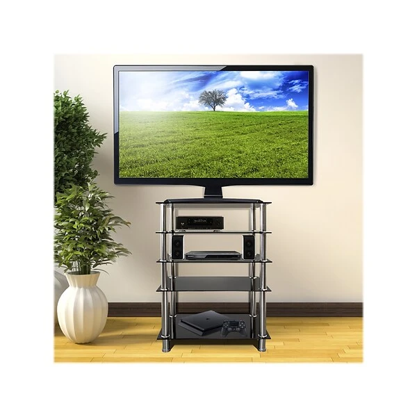 - Five-tier media stand has a spacious surface area to accommodate medium to large components