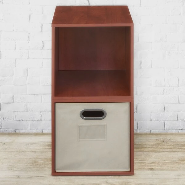Niche Home collection 2 cube storage set comes in a warm cherry finish that shows subtle wood grain to complement your decor. It features a set of two cubes and one folding canvas storage bin which can be rearranged for a customized look.