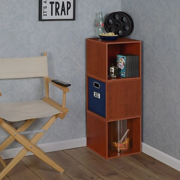 Let your creativity run wild with Cubo! This innovative set of 3 storage cubes by Niche are designed to fasten together in any direction! Connect them in any way you like. In a row, in a pyramid, in a U or L shape or countless other configurations. Start small and add on later. Cubes connect to one another with spring pins, making it easy to customize and create a storage system just for you with a single cube to a set of 12 or more. Niche storage cubes are actually cubes! With interior dimensions of 12 1/8″ x 12 1/8″ x 12 1/8″, they can be used in any direction. There’s no “right” way to use them because all sides measure the same! Who ever said all cubes had to face the front like a bookcase? Cubo storage cubes can attach together in any direction, which opens up a myriad of new design possibilities. Turn one to the right, turn another to the left. Keep one facing front and still another facing the back. Perfect to clean up clutter in closets, entryways, laundry & storage rooms, as a bookcase, nightstand or media storage, in a classroom or children’s room-these cubes fit anywhere! Its rich Cherry finish shows subtle wood grain and is sure to please and coordinates with the rest of the Niche line. No tools LockDowel assembly allows pieces to simply snap together and lock into place for a sturdy, hassle-free build in less than 2 minutes. No more searching for the right size screwdriver or dropping tiny screws. Just snap into place and go. Less hardware and fewer small parts means less plastic packaging and less waste. Add on, arrange and rearrange Niche Foldable Fabric Bins for a fresh, new custom look whenever you like!