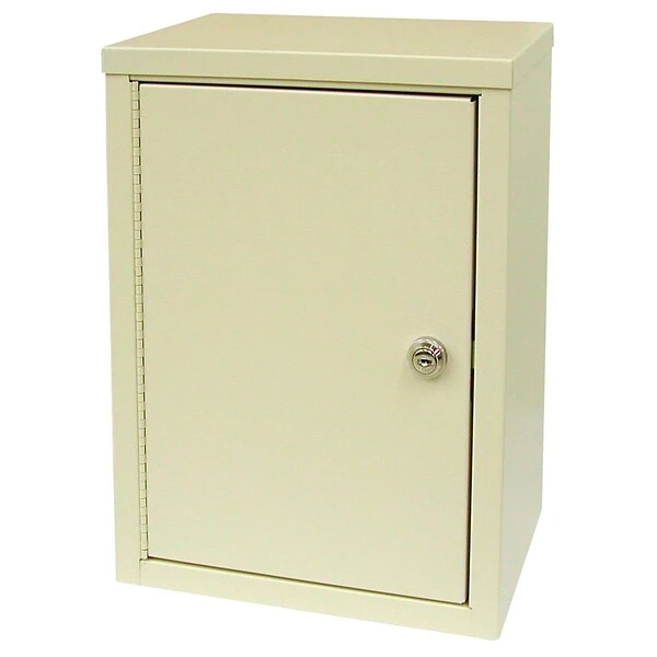 Omnimed Economy Narcotic Cabinets are made of heavy gauge steel with a beige powder coated finish and are built to meet schedule 2 drug storage requirements. They have strong piano hinged doors and a two door, dual flat key locking system to ensure content security. The outside door has a triple bolt lock which opens to a second door secured by a heavy gauge locking cam. Three extra keys are included for each lock. The ambi top of the cabinet lifts so that the unit can be flipped to accommodate left or right outer door access. Its two aluminum shelves are adjustable and increase storage capacity. Pre-drilled holes that are reinforced with stainless steel mounting discs ensure stable wall attachment. Cabinets measure 15H x 11W x 8D and are warranted for 3 years with 1 year on the locks.