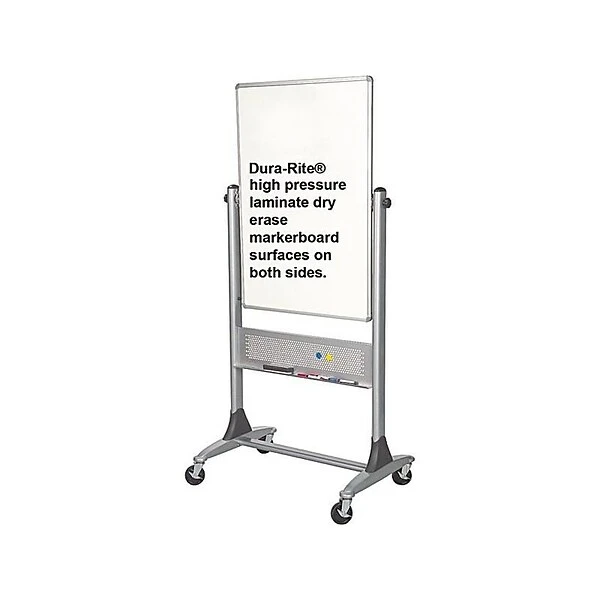 Add a visual component to presentations anywhere with this mobile double-sided dry-erase board. Roll the board into place using the 3-inch casters, then lock the wheels to maintain stability. The two Dura-Rite surfaces provide crisp contrast to text and drawings, and the pivot hinge lets you flip sides quickly during your presentation. This MooreCo marker board has a full-length tray to hold markers or supplies.