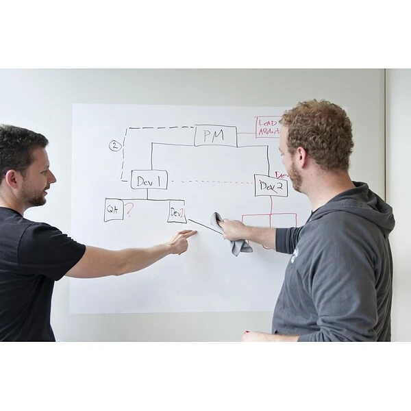 Set Collaboration Free. The Post-it® Super Sticky Dry Erase Surface is designed to stick to a variety of painted drywall and steel surfaces, glass, finished wood, and existing whiteboards or chalkboards. The Post-it® Super Sticky Dry Erase Surface is easy to install and requires no tools – just unroll, peel and stick. Utilizing a proprietary dry erase coating, the Post-it® Super Sticky Dry Erase Surface is stain-proof, erases cleanly every time and writes smoothly. From horizontal applications on desks or tables to vertical applications on surfaces where traditional whiteboards cannot be installed, such as windows, the Post-it® Super Sticky Dry Erase Surface can be cut-to-fit and provides endless possibilities for dry erase solutions in new places. It’s even great for replacing old dry erase surfaces that may be ghosted—simply apply over the existing board and it looks new again.