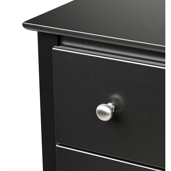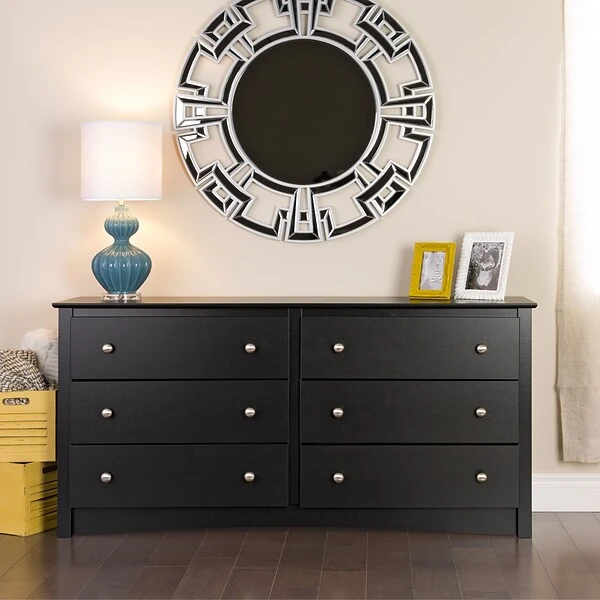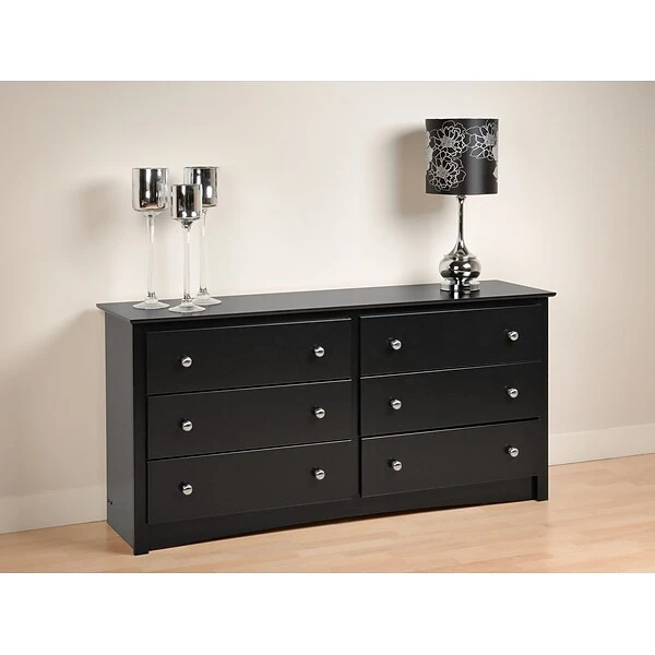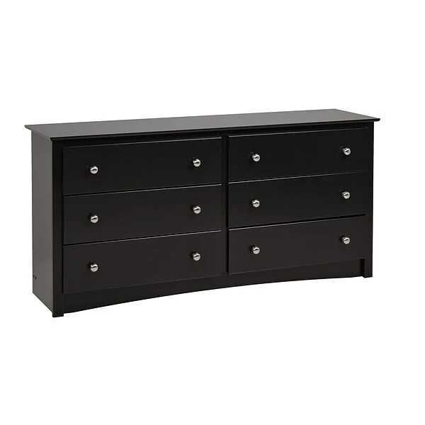 Prepac™ 6-Drawer dresser in black finish is constructed from CARB-compliant laminated composite woods which give an elegant look to any room. Drawer dresser has a sturdy top to pile on your books, cell phone, alarm clock, lamp and more.