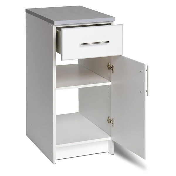 Prepac™ Elite 16″ base cabinet is constructed from CARB-compliant laminated composite woods. Cabinet has durable fresh white laminate finish with 1″ thick worktop with a durable melamine surface.