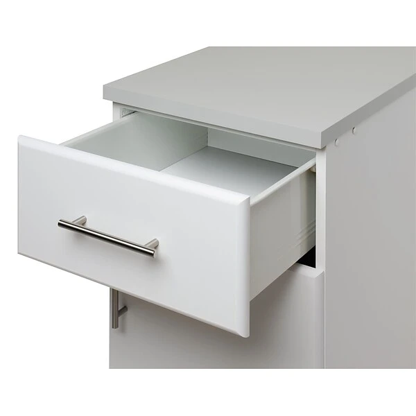 - 1″ thick worktop with a durable melamine surface, stylish brushed metal handles, heavy duty drawer with metal sides