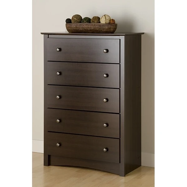 Prepac™ 5-Drawer chest in espresso finish is constructed from CARB-compliant laminated composite woods which give an elegant look to any room. Drawer chest has a sturdy top to pile on your books, cell phone, alarm clock, lamp and more.