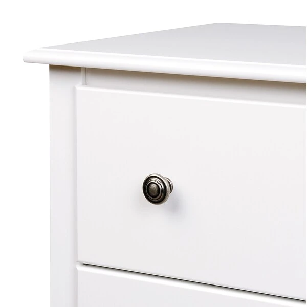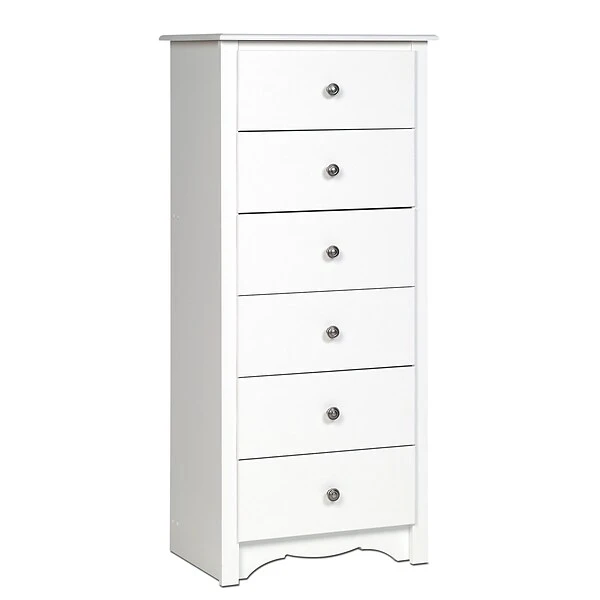 Prepac™ Monterey tall 6-drawer chest in white finish is constructed from CARB-compliant laminated composite woods which give an elegant look to any room. Drawer chest has a sturdy top to pile on your books, cell phone, alarm clock, lamp and more.