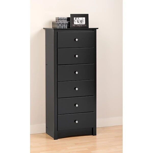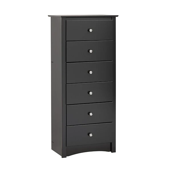 Prepac™ Sonom 6-Drawer chest in black finish is constructed from CARB-compliant laminated composite woods which give an elegant look to any room. Drawer chest has a sturdy top to pile on your books, cell phone, alarm clock, lamp and more.