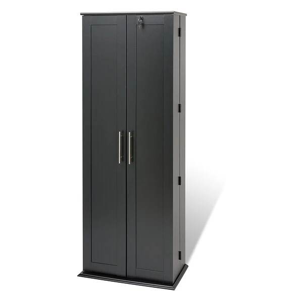 Prepac™ Black grande locking media storage cabinet has an adjustable shelf that holds 702 CDs, 448 DVDs, 658 blu-ray discs and 266 VHS cassettes. Cabinet has offset hinge points that allow 180 degree movement for easy and convenient access.