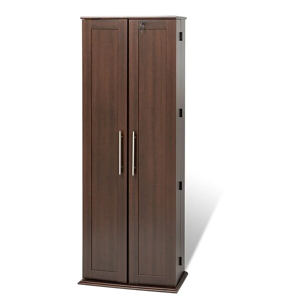 Prepac™ Espresso grande locking media storage cabinet has an adjustable shelf that holds 702 CDs, 448 DVDs, 658 blu-ray discs and 266 VHS cassettes. Cabinet has offset hinge points that allow 180 degree movement for easy and convenient access.