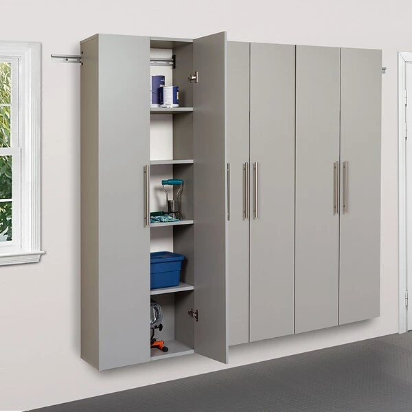 The HangUps Storage Cabinet Collection offers versatility for your ever changing storage needs in the garage, laundry room, office or workshop. The Cabinets mount securely to the wall with a heavy duty metal rail and hook system. The wall mounted feature ensures easy cleaning beneath the cabinets and protects your stored items from water & dirt. The HangUps Collection is constructed using laminated composite wood and features metal handles and adjustable hinges. This product ships ready-to-assemble and includes all hanging rails and fastening bolts. Add other cabinets from our HangUps Collection to create a storage system to convert any cluttered room into an organized space. Set C Includes: (Qty 3) 24” Large Storage Cabinet Model # GSCW-0706-2K 24″W x 72″H x 12″D 3 adjustable shelves and 1 fixed shelf with middle divider (shelves are .75″ thick)Weight Capacity: 200lbs (40lbs per shelf)