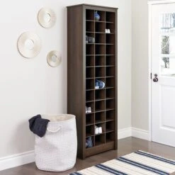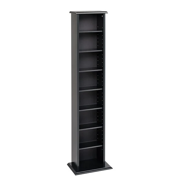 Prepac™ Slim multimedia storage tower in black finish features fully adjustable shelves that can accommodate any size and type of media collection. Tower is trimmed with stylish accent moldings for a sleek and traditional look.
