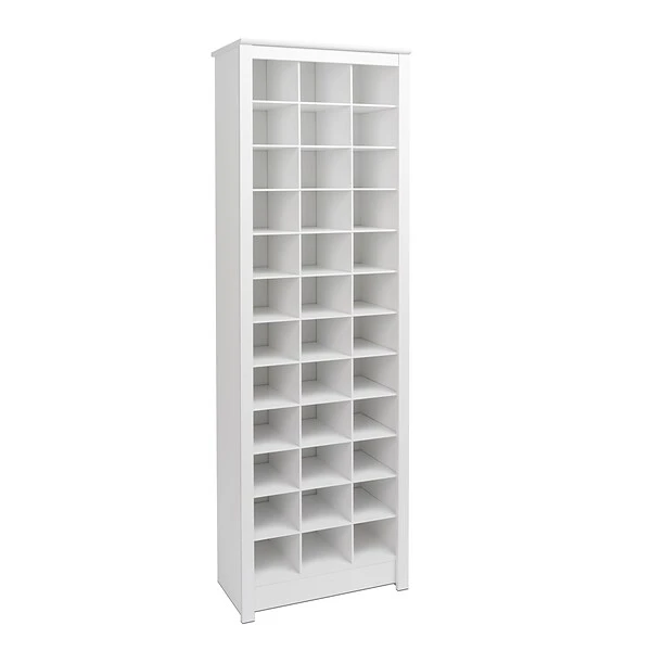 Simply and stylishly organize up to 36 pairs of shoes with the Space-Saving Shoe Storage Cabinet by Prepac. Fit one cabinet in a narrow entryway or combine multiple pieces from the Space-Saving collection in a large mudroom to create a custom closet look at the fraction of the cost. This shoe organizer has 36 spacious cubbies that can be used to store shoes, hats, scarves, keys, mail and any other clutter that needs organizing.