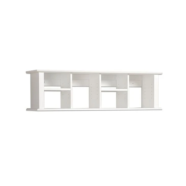 Prepac™ Wall mounted desk hutch in white as four adjustable shelves and fits binders perfectly and can also be used as a floating bookcase or a curio for collectibles. Hutch has dimensions of 13″H x 48″W x 11.5″D.