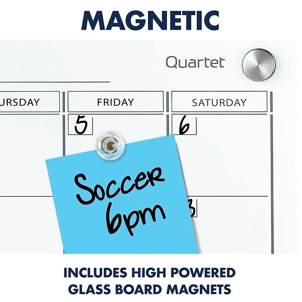 Organize home or office schedules with this magnetic dry-erase calendar. The durable glass surface erases easily and resists staining for convenient month-after-month use, and included mounting hardware makes installation hassle-free. With its magnetic surface, this Quartet Infinity Glass frameless dry-erase calendar also serves as a bulletin board for notes and reminders.