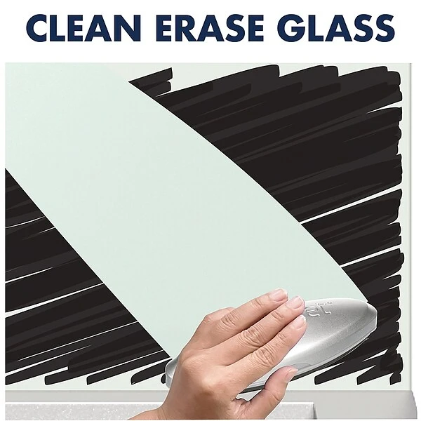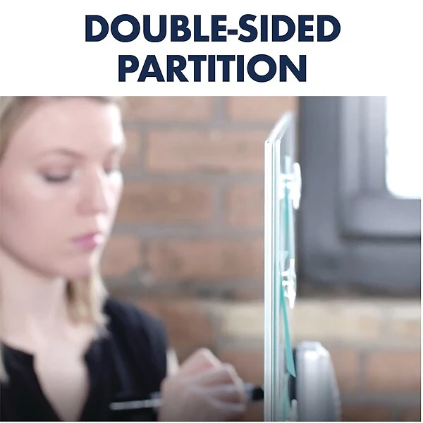 - Elevate your desk with a premium glass dry-erase board. The sleek design blends with any décor while adding modern style to your space. Double-sided glass can be used as a partition.